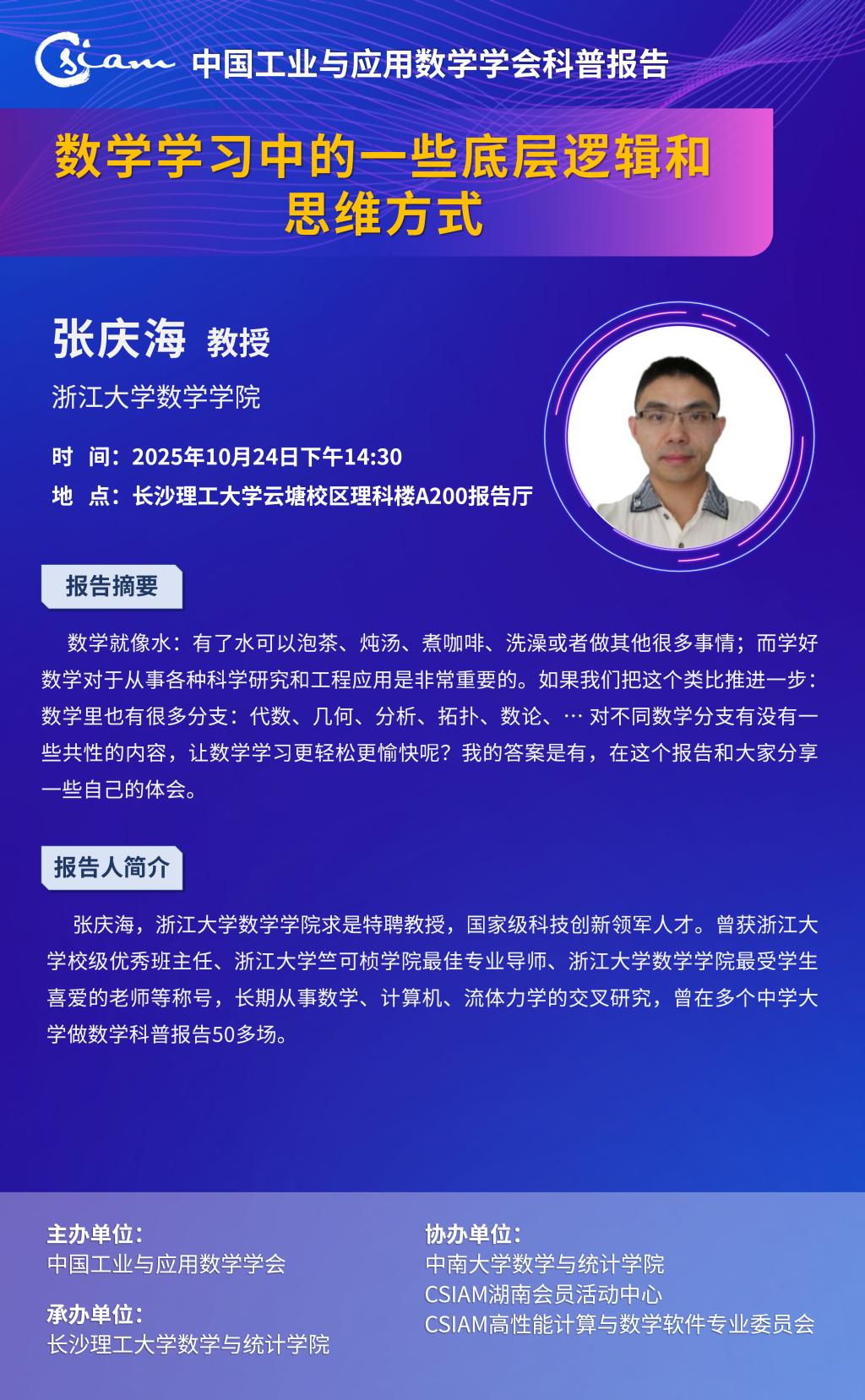 报告人简介:张庆海,浙江大学数学学院求是特聘教授,国家级科技创新领军人才。曾获浙江大学校级优秀班主任、浙江大学竺可桢学院最佳专业导师、浙江大学数学学院最受学生喜爱的老师等称号,长期从事数学、计算机、流体力学的交叉研究,曾在多个中学大学做数学科普报告50多场。